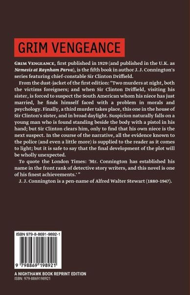 Grim Vengeance, first published in 1929 (and published in the U.K. as Nemesis at Raynham Parva), is the fifth book in author J. J. Connington's series featuring chief-constable Sir Clinton Driffield. From the dust-jacket of the first edition: "Two murders at night, both the victims foreigners; and when Sir Clinton Driffield, visiting his sister, is forced to suspect the South American whom his niece has just married, he finds himself faced with a problem in morals and psychology. Finally, a third murder takes place, this one in the house of Sir Clinton's sister, and in broad daylight. Suspicion naturally falls on a young man who is found standing beside the body with a pistol in his hand; but Sir Clinton clears him, only to find that his own niece is the next suspect. In the course of the narrative, all the evidence known to the police (and even a little more) is supplied to the reader as it comes to light; but it is safe to say that the final development of the plot will be wholly unexpected. To quote the London Times: 'Mr. Connington has established his name in the front rank of detective story writers, and this novel is one of his finest achievements.' " J. J. Connington is a pen-name of Alfred Walter Stewart (1880-1947).