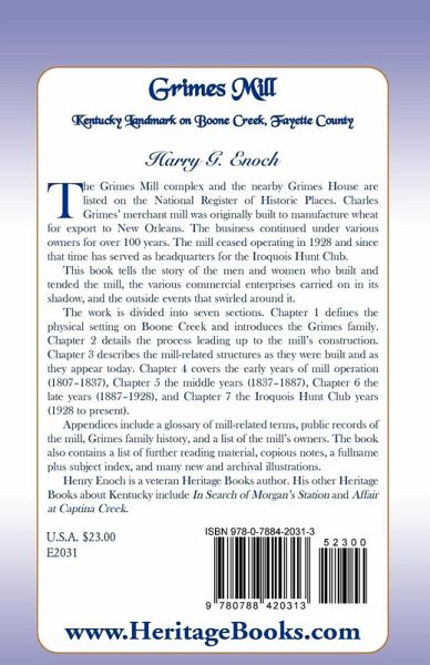 The Grimes Mill complex and the nearby Grimes House are listed on the National Register of Historic Places. Charles Grimes' merchant mill was originally built to manufacture wheat for export to New Orleans. The business continued under various owners for over 100 years. The mill ceased operating in 1928 and since that time has served as headquarters for the Iroquois Hunt Club. This book tells the story of the men and women who built and tended the mill, the various commercial enterprises carried on in its shadow, and the outside events that swirled around it. The work is divided into seven sections. Chapter 1 defines the physical setting on Boone Creek and introduces the Grimes family. Chapter 2 details the process leading up to the mill's construction. Chapter 3 describes the mill-related structures as they were built and as they appear today. Chapter 4 covers the early years of mill operation (1807-1837), Chapter 5 the middle years (1837-1887), Chapter 6 the late years (1887-1928), and Chapter 7 the Iroquois Hunt Club years (1928 to present). Appendices include a glossary of mill-related terms, public records of the mill, Grimes family history, and a list of the mill's owners. The book also contains a list of further reading material, copious notes, a fullname plus subject index, and many new and archival illustrations. Henry Enoch is a veteran Heritage Books author. His other Heritage Books about Kentucky include In Search of Morgan's Station and Affair at Captina Creek.