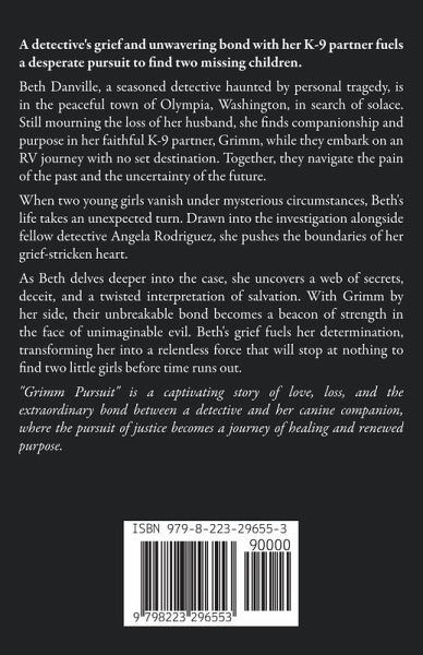 A detective's grief and unwavering bond with her K-9 partner fuels a desperate pursuit to find two missing children. Beth Danville, a seasoned detective haunted by personal tragedy, is in the peaceful town of Olympia, Washington, in search of solace. Still mourning the loss of her husband, she finds companionship and purpose in her faithful K-9 partner, Grimm, while they embark on an RV journey with no set destination. Together, they navigate the pain of the past and the uncertainty of the future. When two young girls vanish under mysterious circumstances, Beth's life takes an unexpected turn. Drawn into the investigation alongside fellow detective Angela Rodriguez, she pushes the boundaries of her grief-stricken heart. As Beth delves deeper into the case, she uncovers a web of secrets, deceit, and a twisted interpretation of salvation. With Grimm by her side, their unbreakable bond becomes a beacon of strength in the face of unimaginable evil. Beth's grief fuels her determination, transforming her into a relentless force that will stop at nothing to find two little girls before time runs out. "Grimm Pursuit" is a captivating story of love, loss, and the extraordinary bond between a detective and her canine companion, where the pursuit of justice becomes a journey of healing and renewed purpose.