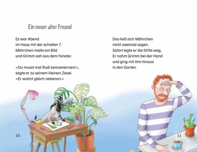 Grimms bester Freund - neben Möhrchen natürlich - ist sein Nachbar Rudi. Dem gehört die Tankstelle 'Tankeschön', ein spannender Ort für den kleinen Zesel. Und noch toller: Rudi kann richtig gut werkeln. Und so baut er Möhrchen ein feuerwehrrotes Tretauto! Damit rast der kleine Zesel um die Tankstelle herum und erlebt so manche Überraschung.