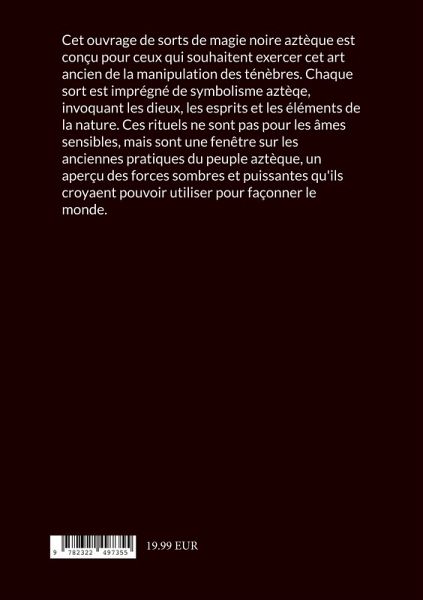 Cet ouvrage de sorts de magie noire aztèque est conçu pour ceux qui souhaitent exercer cet art ancien de la manipulation des ténèbres. Chaque sort est imprégné de symbolisme aztèque, invoquant les dieux, les esprits et les éléments de la nature. Ces rituels ne sont pas pour les âmes sensibles, mais sont une fenêtre sur les anciennes pratiques du peuple aztèque, un aperçu des forces sombres et puissantes qu'ils croyaient pouvoir utiliser pour façonner le monde.