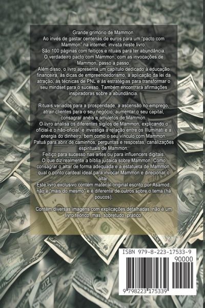 Grande grimório de Mammon. Ao invés de gastar centenas de euros para um "pacto com Mammon" na internet, invista neste livro. São 100 páginas com feitiços e rituais para ter abundância. O verdadeiro pacto com Mammon, com as invocações de Mammon, passo a passo. Além disso, o livro apresenta um capítulo dedicado à educação financeira, às dicas de empreendedorismo, à aplicação da lei da atração, às técnicas de PNL e às estratégias para transformar o seu mindset para o sucesso. Também encontrará afirmações inspiradoras sobre a abundância. Rituais variados para a prosperidade, a ascensão no emprego, atrair clientes para o seu negócio, aumentar o seu capital, consagrar anéis e amuletos de Mammon. O livro analisa os diferentes sigilos de Mammon, explicando o oficial e o não-oficial, e investiga a relação entre os Illuminati e a energia do dinheiro, bem como o seu vínculo com Mammon. Patuá para abrir de caminhos, perguntas e respostas, canalizações espirituais de Mammon. Feitiço para sucesso nas artes ou para influencers digitais. O que diz realmente a bíblia judaica sobre Mammon. Como consagrar o altar de forma adequada e a estatueta de Mammon, qual o ponto cardeal ideal para invocar Mammon e direcionar o altar. Este livro exclusivo contém material original escrito por Asamod, não é "mais do mesmo" e é diferente de outros sobre o tema (há poucos). Contém diversas imagens com explicações detalhadas, não é um livro teórico, mas, sobretudo, prático.