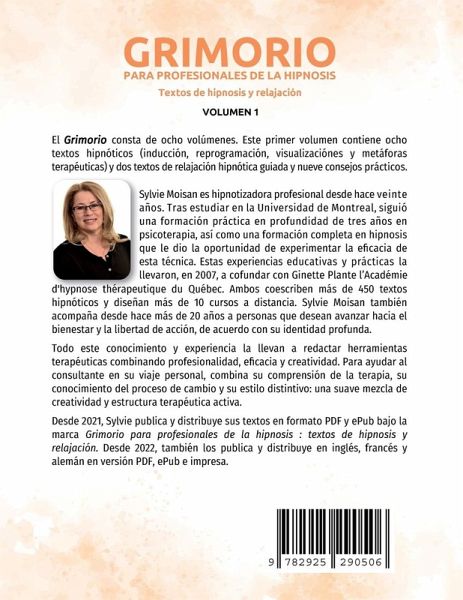 Descubra y abrace este Grimorio para profesionales de la hipnosis de una autora experimentada, practicante y formadora capacitada. Este primer volumen de una serie de ocho comienza con un discurso de inducción, El Eco Hipnótico, diseñado para promover un estado de trance en combinación con los textos de hipnosis, visualización y relajación que se ofrecen. Los temas de estos nueve textos son únicos: salir de una situación difícil, avanzar hacia un estado de bienestar, liberarse de las ataduras tóxicas, deshacerse de una creencia limitante, consolidar la disciplina alimentaria, ajustar el volumen de los sonidos considerados molestos, recuperar el equilibrio presupuestario, reducir las secuelas de un accidente cerebrovascular, enriquecer la vida a través de la imaginación creativa. Cada uno de los nueve textos propone objetivos de apoyo a la persona que consulta, así como un perfil de la clientela objetivo. Por último, cada texto ofrece una herramienta de refuerzo en forma de consejo práctico. En resumen, el Grimorio le proporciona, como profesional de la hipnosis, las herramientas necesarias para ofrecer un apoyo óptimo a sus clientes, combinando profesionalidad, eficacia y creatividad.