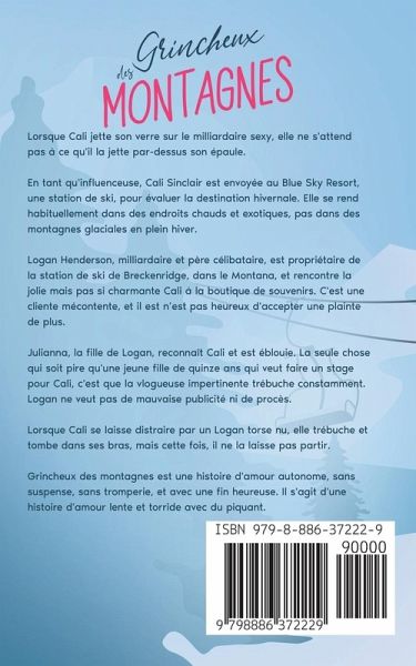Lorsque Cali jette son verre sur le milliardaire sexy, elle ne s'attend pas à ce qu'il la jette par-dessus son épaule. En tant qu'influenceuse, Cali Sinclair est envoyée au Blue Sky Resort, une station de ski, pour évaluer la destination hivernale. Elle se rend habituellement dans des endroits chauds et exotiques, pas dans des montagnes glaciales en plein hiver. Logan Henderson, milliardaire et père célibataire, est propriétaire de la station de ski de Breckenridge, dans le Montana, et rencontre la jolie mais pas si charmante Cali à la boutique de souvenirs. C'est une cliente mécontente, et il est n'est pas heureux d'accepter une plainte de plus. Julianna, la fille de Logan, reconnaît Cali et est éblouie. La seule chose qui soit pire qu'une jeune fille de quinze ans qui veut faire un stage pour Cali, c'est que la vlogueuse impertinente trébuche constamment. Logan ne veut pas de mauvaise publicité ni de procès. Lorsque Cali se laisse distraire par un Logan torse nu, elle trébuche et tombe dans ses bras, mais cette fois, il ne la laisse pas partir. Grincheux des montagnes est une histoire d'amour autonome, sans suspense, sans tromperie, et avec une fin heureuse. Il s'agit d'une histoire d'amour lente et torride avec du piquant.