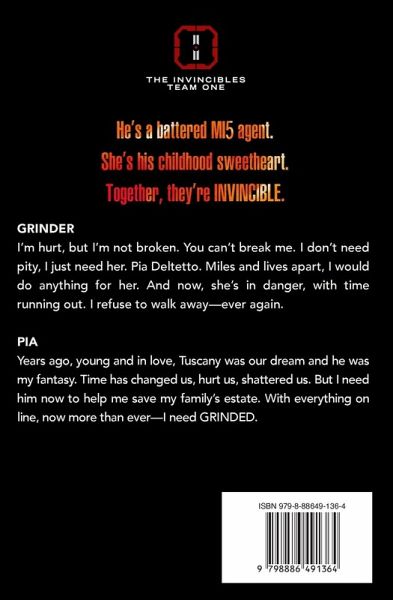 He's a battered M15 agent. She's his childhood sweetheart. Together, they're INVINCIBLE. GRINDER I'm hurt, but I'm not broken. You can't break me. I don't need pity, I just need her. Pia Deltetto. Miles and lives apart, I would do anything for her. And now, she's in danger, with time running out. I refuse to walk away-ever again. ¿PIA Years ago, young and in love, Tuscany was our dream and he was my fantasy. Time has changed us, hurt us, shattered us. But I need him now to help me save my family's estate. With everything on line, now more than ever-I need GRINDED. While each book in the invincibles series is a standalone with its own HEA, they may be more enjoyable read in order.