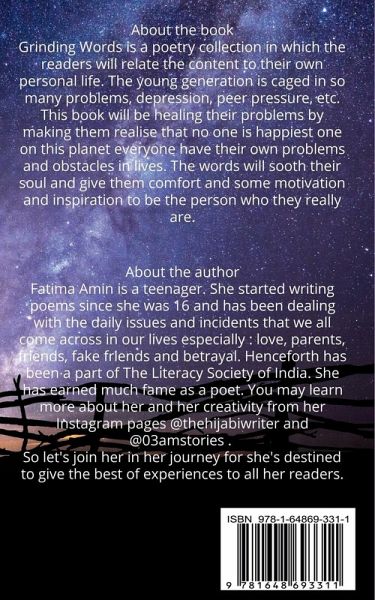 Grinding Words is a poetry collection in which the readers will relate the content to their own personal life. The young generation is caged in so many problems, depression, peer pressure, etc. This book will be healing their problems by making them realise that no one is happiest one on this planet everyone have their own problems and obstacles in lives. The words will sooth their soul and give them comfort and some motivation and inspiration to be the person who they really are.