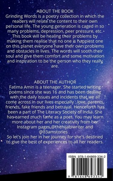 Grinding Words is a poetry collection in which the readers will relate the content to their own personal life. The young generation is caged in so many problems, depression, peer pressure, etc. This book will be healing their problems by making them realise that no one is happiest one on this planet everyone have their own problems and obstacles in lives. The words will sooth their soul and give them comfort and some motivation and inspiration to be the person who they really are.