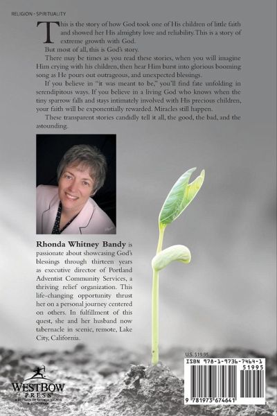 This is the story of how God took one of His children of little faith and showed her His almighty love and reliability. This is a story of extreme growth with God. But most of all, this is God's story. There may be times as you read these stories, when you will imagine Him crying with his children, then hear Him burst into glorious booming song as He pours out outrageous, and unexpected blessings. If you believe in "it was meant to be," you'll find fate unfolding in serendipitous ways. If you believe in a living God who knows when the tiny sparrow falls and stays intimately involved with His precious children, your faith will be exponentially rewarded. Miracles still happen. These transparent stories candidly tell it all, the good, the bad, and the astounding.