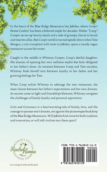 In the heart of the Blue Ridge Mountains lies Jubilee, where Coop's Home Cookin' has been a beloved staple for decades. Walter "Coop" Cooper serves up hearty meals and a side of grumpy charm to locals and tourists alike. But Coop's world is turned upside down when Tate Morgan, a city transplant with roots in Jubilee, opens a trendy vegan restaurant across the street. Caught in the middle is Whitney Cooper, Coop's dutiful daughter. She dreams of opening her own wellness studio but feels obligated to her father's diner. As tensions between Coop and Tate escalate, Whitney finds herself torn between loyalty to her father and her growing feelings for Tate. When Coop enlists Whitney to sabotage the new restaurant, she must choose between her father's expectations and her own dreams. As secrets come to light and friendships blossom, Whitney navigates the challenges of family loyalty and personal aspirations. Grits and Grievances is a heartwarming tale of family, love, and the courage to pursue one's dreams, set against the picturesque backdrop of the Blue Ridge Mountains. Will Jubilee find room for both tradition and innovation, or will old rivalries tear them apart?