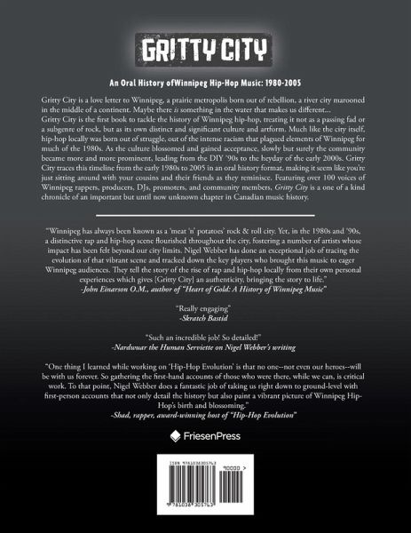 Gritty City is a love letter to Winnipeg, a prairie metropolis born out of rebellion, a river city marooned in the middle of a continent. Maybe there is something in the water that makes us different... Gritty City is the first book to tackle the history of Winnipeg hip-hop, treating it not as a passing fad or a subgenre of rock, but as its own distinct and significant culture and artform. Much like the city itself, hip-hop locally was born out of struggle, out of the intense racism that plagued elements of Winnipeg for much of the 1980s. As the culture blossomed and gained acceptance, slowly but surely the community became more and more prominent, leading from the DIY '90s to the heyday of the early 2000s. Gritty City traces this timeline from the early 1980s to 2005 in an oral history format, making it seem like you're just sitting around with your cousins and their friends as they reminisce. Featuring over 100 voices of Winnipeg rappers, producers, DJs, promoters, and community members, Gritty City is a one of a kind chronicle of an important but until now unknown chapter in Canadian music history.