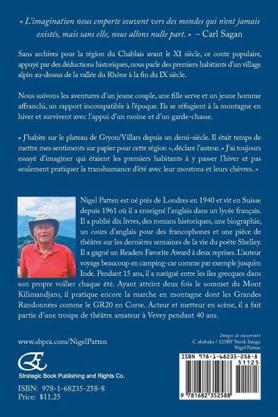« L'imagination nous emporte souvent vers des mondes qui n'ont jamais existés, mais sans elle, nous allons nulle part. » - Carl Sagan Sans archives pour la région du Chablais avant le XI siècle, ce conte populaire, appuyé par des déductions historiques, nous parle des premiers habitants d'un village alpin au-dessus de la vallée du Rhône à la fin du IX siècle. Nous suivons les aventures d'un jeune couple, une fille serve et un jeune homme affranchi, un rapport incompatible à l'époque. Ils se réfugient à la montagne en hiver et survivent avec l'appui d'un moine et d'un garde-chasse. « J'habite sur le plateau de Gryon/Villars depuis un demi-siècle. Il était temps de mettre mes sentiments sur papier pour cette région », déclare l'auteur. « J'ai toujours essayé d'imaginer qui étaient les premiers habitants à y passer l'hiver et pas seulement pratiquer la transhumance d'été avec leur moutons et leurs chèvres. » (A propos de l'auteur) Nigel Patten est né près de Londres en 1940 et vit en Suisse depuis 1961 où il a enseigné l'anglais dans un lycée français. Il a publié dix livres, des romans historiques, une biographie, un cours d'anglais pour des francophones et une pièce de théâtre sur les dernières semaines de la vie du poète Shelley. Il a gagné un Readers Favorite Award à deux reprises. L'auteur voyage beaucoup en camping-car comme par exemple jusqu'en Inde. Pendant 15 ans, il a navigué entre les îles grecques dans son propre voilier chaque été. Ayant atteint deux fois le sommet du Mont Kilimandjaro, il pratique encore la marche en montagne dont les Grandes Randonnées comme le GR20 en Corse. Acteur et metteur en scène, il a fait partie d'une troupe de théâtre amateur à Vevey pendant 40 ans.