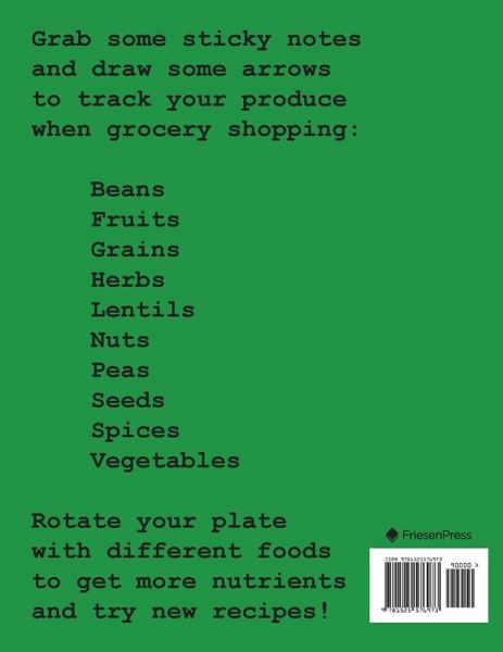 Grab some sticky notes and draw some arrows to track your produce when grocery shopping: Beans Fruits Grains Herbs Lentils Nuts Peas Seeds Spices Vegetables Rotate your plate with different foods to get more nutrients and try new recipes!