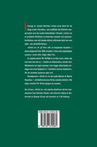 I Sverige är Joseph Sheridan Le Fanu (1814-73) mest känd för sin långa novell Carmilla, som stadfäste den litterära vampyrmyten som den sedan behandlades i Dracula. Le Fanu var en produktiv författare av historiska romaner och mysterieberättelser, men sitt kanske största inflytande hade han som spök- och skräckförfattare. Grönt te är på flera sätt en betydande klassiker. I denna långnovell från 1869 utvecklar Le Fanu den psykologiska rysaren i arvet efter Edgar Allan Poe. En engelsk pastor blir förföljd av en liten svart, ilsken apa som bara han kan se -- kanske en hallucination, kanske inte. Händelserna tar lugnt avstamp i den trygga viktorianska vardagen men dras långsamt in i "helvetets enorma maskineri", för att använda pastorns egna ord. Huvudperson i Grönt te är den tyske läkaren dr Martin Hesselius -- världslitteraturens första ockulta detektiv. Här utges novellen för första gången på svenska. Om Le Fanu, Grönt te och ockulta detektiver skriver konnässören Sven Christer Swahn i sitt efterord. Boken är illustrerad av Nicolas Krizan.