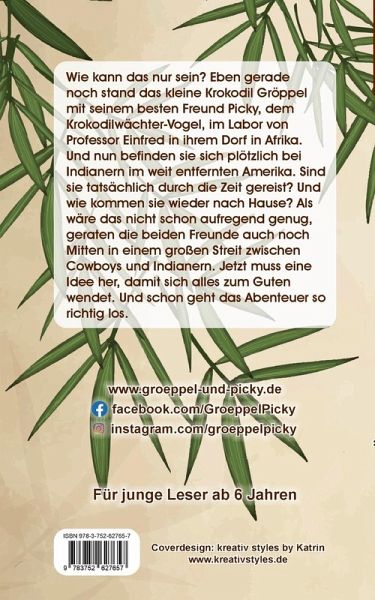 Wie kann das nur sein? Eben gerade noch stand das kleine Krokodil Gröppel mit seinem besten Freund Picky, dem Krokodilwächter-Vogel, im Labor von Professor Einfred in ihrem Dorf in Afrika. Und nun befinden sie sich plötzlich bei Indianern im weit entfernten Amerika. Sind sie tatsächlich durch die Zeit gereist? Und wie kommen sie wieder nach Hause? Als wäre das nicht schon aufregend genug, geraten die beiden Freunde auch noch mitten in einen großen Streit zwischen Cowboys und Indianern. Jetzt muss eine Idee her, damit sich alles zum Guten wendet. Und schon geht das Abenteuer so richtig los.