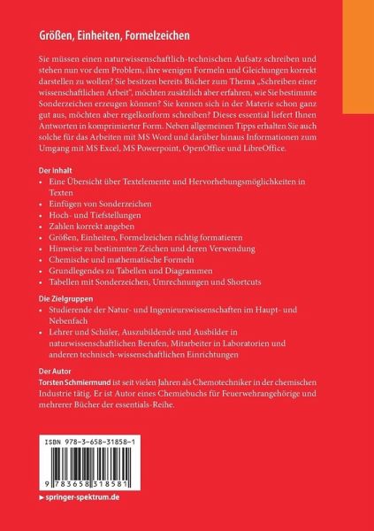 Sie müssen einen naturwissenschaftlich-technischen Aufsatz schreiben und stehen nun vor dem Problem, ihre wenigen Formeln und Gleichungen korrekt darstellen zu wollen? Sie besitzen bereits Bücher zum Thema "Schreiben einer wissenschaftlichen Arbeit", möchten zusätzlich aber erfahren, wie Sie bestimmte Sonderzeichen erzeugen können? Sie kennen sich in der Materie schon ganz gut aus, möchten aber regelkonform schreiben? Dieses essential liefert Ihnen Antworten in komprimierter Form. Neben allgemeinen Tipps erhalten Sie auch solche für das Arbeiten mit MS Word und darüber hinaus Informationen zum Umgang mit MS Excel, MS Powerpoint, OpenOffice und LibreOffice.