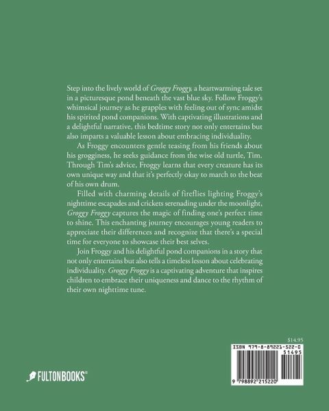 Step into the lively world of Groggy Froggy, a heartwarming tale set in a picturesque pond beneath the vast blue sky. Follow Froggy's whimsical journey as he grapples with feeling out of sync amidst his spirited pond companions. With captivating illustrations and a delightful narrative, this bedtime story not only entertains but also imparts a valuable lesson about embracing individuality. As Froggy encounters gentle teasing from his friends about his grogginess, he seeks guidance from the wise old turtle, Tim. Through Tim's advice, Froggy learns that every creature has its own unique way and that it's perfectly okay to march to the beat of his own drum. Filled with charming details of fireflies lighting Froggy's nighttime escapades and crickets serenading under the moonlight, Groggy Froggy captures the magic of finding one's perfect time to shine. This enchanting journey encourages young readers to appreciate their differences and recognize that there's a special time for everyone to showcase their best selves. Join Froggy and his delightful pond companions in a story that not only entertains but also tells a timeless lesson about celebrating individuality. Groggy Froggy is a captivating adventure that inspires children to embrace their uniqueness and dance to the rhythm of their own nighttime tune.