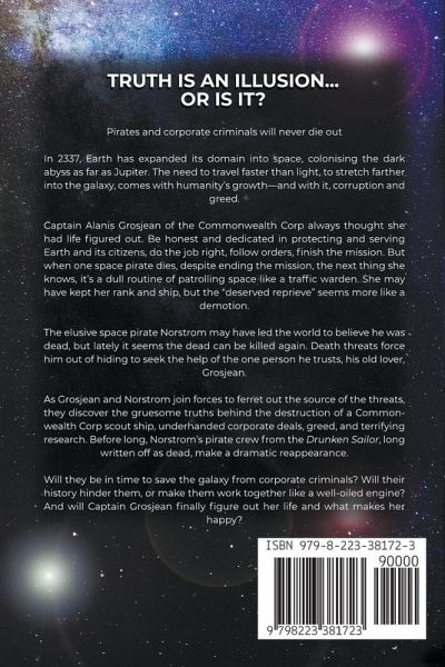 Truth is an illusion...or is it? Pirates and corporate criminals will never die out. In 2337, Earth has expanded its domain into space, colonising the dark abyss as far as Jupiter. The need to travel faster than light, to stretch farther into the galaxy, comes with humanity's growth—and with it, corruption and greed. Captain Alanis Grosjean of the Commonwealth Corp always thought she had life figured out. Be honest and dedicated in protecting and serving Earth and its citizens, do the job right, follow orders, finish the mission. But when one space pirate dies, despite ending the mission, the next thing she knows, it's a dull routine of patrolling space like a traffic warden. She may have kept her rank and ship, but the "deserved reprieve" seems more like a demotion. The elusive space pirate Norstrom may have led the world to believe he was dead, but lately it seems the dead can be killed again. Death threats force him out of hiding to seek the help of the one person he trusts, his old lover, Grosjean. As Grosjean and Norstrom join forces to ferret out the source of the threats, they discover the gruesome truths behind the destruction of a Commonwealth Corp scout ship, underhanded corporate deals, greed, and terrifying research. Before long, Norstrom's pirate crew from the Drunken Sailor, long written off as dead, make a dramatic reappearance. Will they be in time to save the galaxy from corporate criminals? Will their history hinder them, or make them work together like a well-oiled engine? And will Captain Grosjean finally figure out her life and what makes her happy?