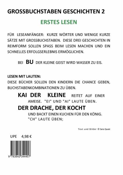 Erstes Lesen: Kurze Wörter und wenige kurze Sätze mit Großbuchstaben. Diese drei Geschichten in Reimform sollen Spaß beim Lesen machen und ein schnelles Erfolgserlebnis ermöglichen._ Bei Bu der kleine Geist wird Wasser zu Eis.Lesen mit Lauten:Diese Bücher sollen den Kindern die Chance geben, Buchstabenkombinationen zu üben._ Kai der Kleine reitet auf einer Ameise._ Der Drache, der kocht und backt einen Kuchen für den König.