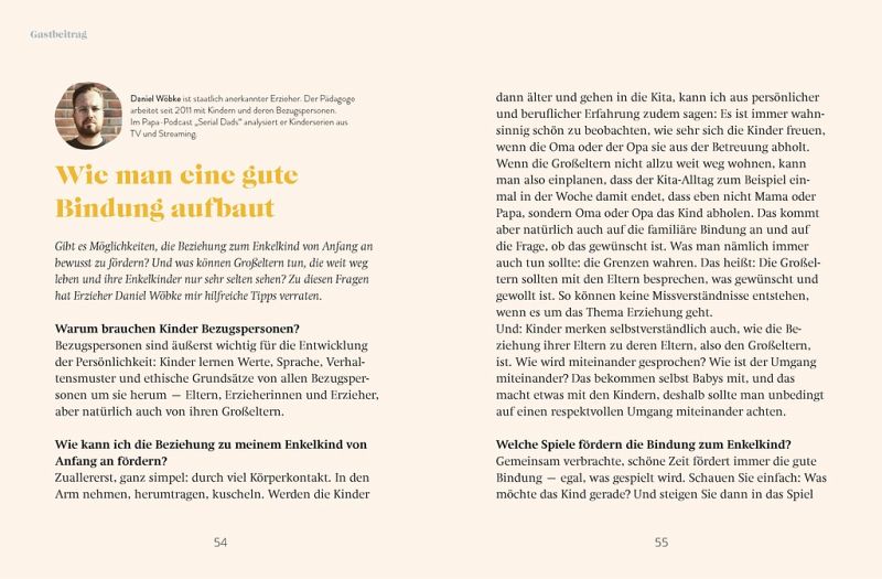 Die Autorin erzählt Geschichten aus dem echten Leben, in denen Oma und Opa den Alltag retten. Hinzu kommen Gastbeiträge von prominenten Großeltern, Generationenforschern und glücklichen Enkelkindern sowie konkrete Tipps und Tricks, um die Zeit mit dem Enkelkind noch wundervoller zu gestalten.