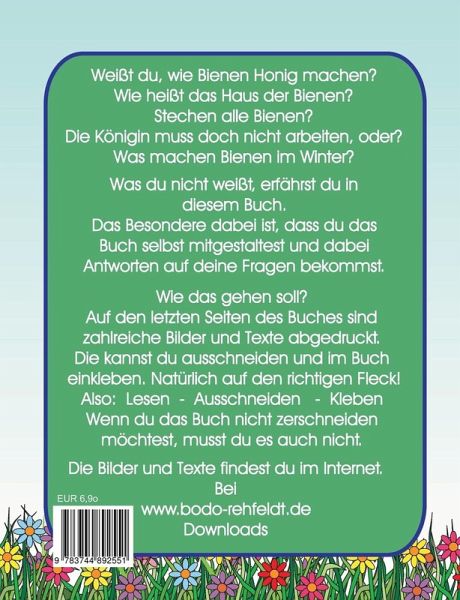 Weißt du, wie Bienen Honig machen? Wie heißt das Haus der Bienen? Stechen alle Bienen? Die Königin muss doch nicht arbeiten, oder? Was machen Bienen im Winter?Was du nicht weißt, erfährst du in diesem Buch. Das Besondere dabei ist, dass du das Buch selbst gestaltest und dabei Antworten auf deine Fragen bekommst.Wie das gehen soll? Auf den hinteren Seiten des Buches sind zahlreiche Bilder und Texte abgedruckt. Die kannst du ausschneiden und im Buch einkleben. Natürlich auf den richtigen Fleck!Also: Lesen - Ausschneiden - KlebenWenn du das Buch nicht zerschneiden möchtest, musst du es auch nicht. Die Bilder und Texte findest du auch im Internet, bei www.bodo-rehfeldt.de und Download.