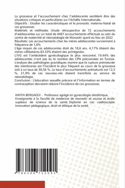 La grossesse et l'accouchement chez l'adolescente semblent être des situations critiques et particulières sur l'échelle internationale. Objectifs : Etudier les caractéristiques et le pronostic materno-foetal de ces grossessesMatériels et méthodes :Etude rétrospective de 72 accouchements d'adolescentes sur un total de 4487 accouchements effectués au sein du centre de maternité et néonatologie de Monastir ayant eu lieu en 2022Résultats: Les accouchements chez les mères adolescentes surviennent à fréquence de 1,6%L'âge moyen de ces adolescentes était de 18,6 ans. 4,17% étaient des mères célibataires.83.33% étaient des primigestes. L'IVG est l'antécédent gynécologique le plus rencontré. 19.44% des adolescentes n'ont pas eu le nombre des CPN préconisées en Tunisie. L'analyse des pathologies gravidiques montre que la rupture prématurée des membranes est l'incident le plus fréquent au cours de la grossesse soit à un taux de 30,56 %. Le taux d'accouchements prématurés est 12,5 %. 21,9% de ces nouveau-nés étaient transférés au service de néonatologie.Conclusion : L'éducation sexuelle précoce et l'information en termes de contraception devraient réduire l'incidence de ces grossesses.