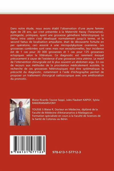 Dans notre étude, nous avons établi l'observation d'une jeune femme âgée de 28 ans, qui s'est présentée à la Maternité Itaosy (Tananarive), primigeste, primipare, ayant une grossesse gémellaire hétérotopique. Le f tus intra utérin s'est développé normalement jusqu'à terme, et le second f tus de localisation ampullaire, était de découverte fortuite en per opératoire, ceci associé à une micropolykystose ovarienne. Les grossesses combinées sont rares mais non exceptionnelles, leur incidence est de 1 cas pour 30 000 grossesses et 1 cas pour 125 grossesses ectopiques selon la littérature. Ce diagnostic est rarement évoqué précocement à cause de l'existence d'une grossesse intra utérine. Le motif de l'intervention chirurgicale est le plus souvent un abdomen aigu. En cas de recours aux méthodes de la procréation médicalement assistée, la recherche de ces grossesses hétérotopiques doit être systématique; la précocité du diagnostic, notamment à l'aide d'échographie permet de proposer un traitement chirurgical c lioscopique avec une amélioration du pronostic.