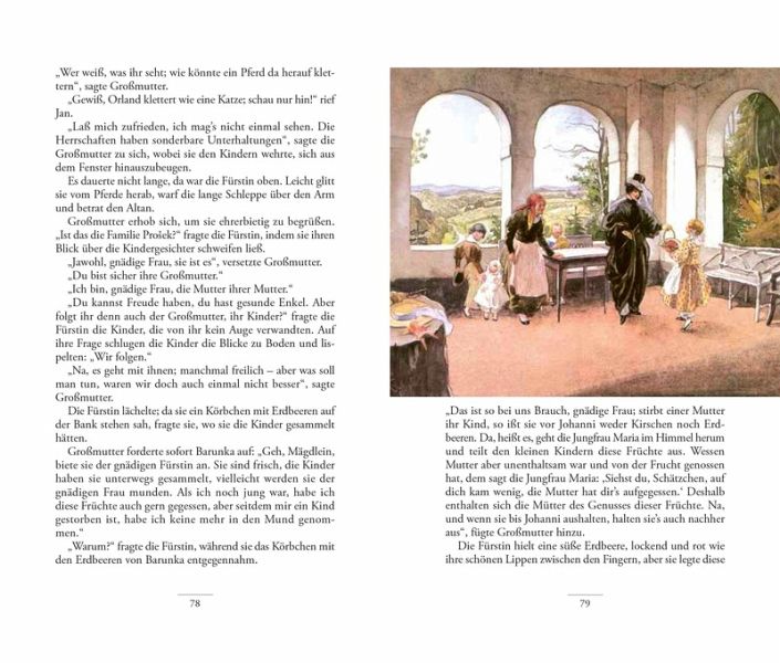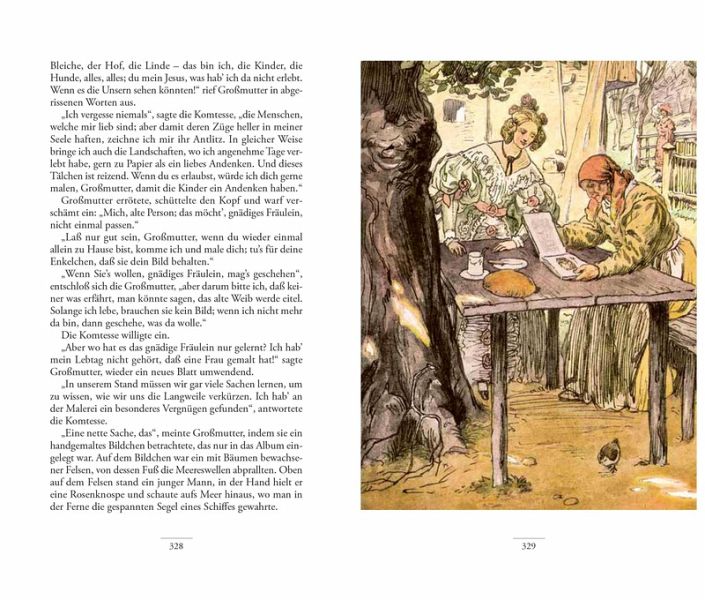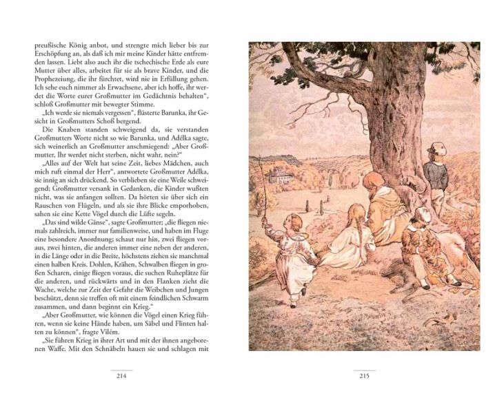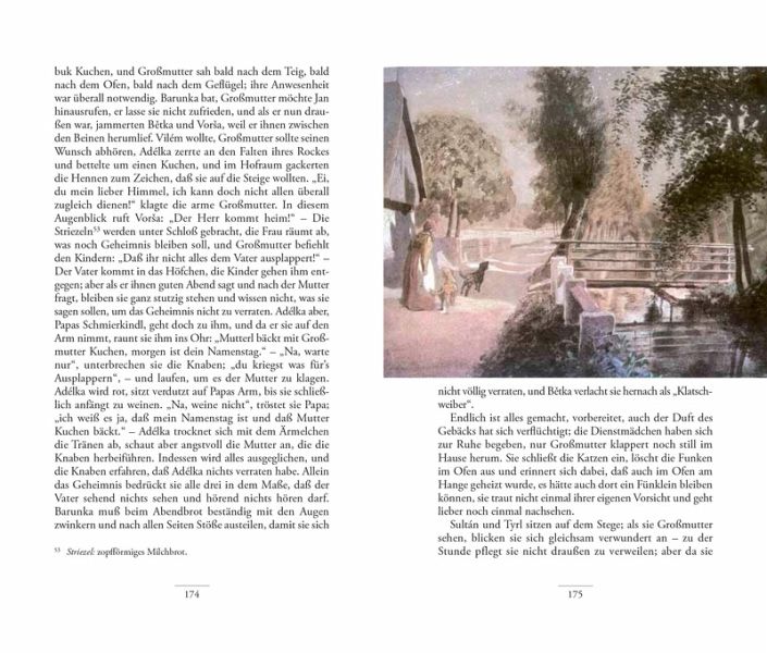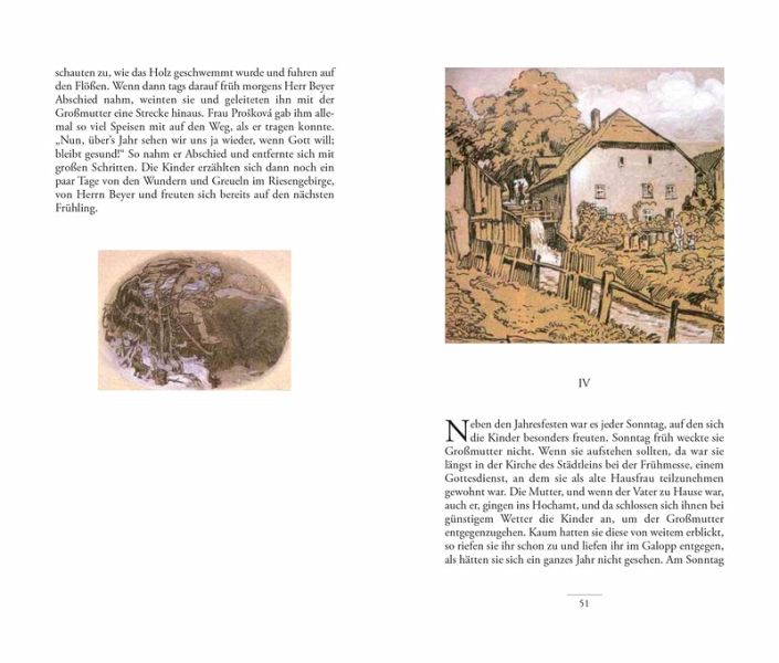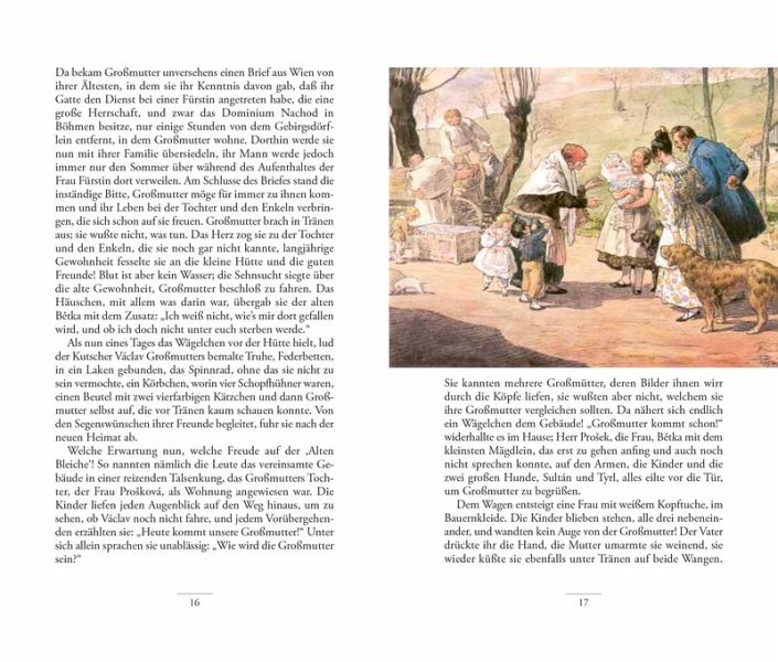 In diesem wohl wichtigsten und schönsten Klassiker der tschechischen Literatur erzählt Bozena Nemcová (1820-1862) von einer gütigen und liebevollen Großmutter, die in das ländliche Anwesen ihrer Tochter gerufen wird. Die weise Frau hilft bei der Betreuung der Kinder und sieht in Haus und Hof nach dem Rechten. Gekonnt verbindet die Autorin die Schilderung von Bräuchen und Sitten im alten Böhmen mit Erinnerungen an ihre eigene Kindheit im Waldtal der Aupa, dem heutigen "Großmuttertal" unweit des Riesengebirges. Herausragend ist die Geschichte von der Bauerntochter Viktorka, die gemütskrank nach tragischem Liebesleid bei den wilden Tieren im Walde lebt. Generationen von Lesern verknüpfen das Großmütterchen mit den klassischen Bildern des tschechischen Illustrators Adolf Kaspar (1877-1934). Seine aufwendig restaurierten Aquarelle und Federzeichnungen machen die vorliegende Ausgabe zum bibliophilen Kunstwerk.