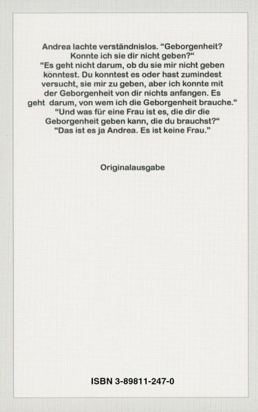 Andrea lachte verständnislos. "Geborgenheit? Konnte ich sie dir nicht geben?" "Es geht nicht darum, ob du sie mir nicht geben konntest. Du konntest es oder hast zumindest versucht, sie mir zu geben, aber ich konnte mit der Geborgenheit von dir nichts anfangen. Es geht darum, von wem ich die Geborgenheit brauche." "Und was für eine Frau ist es, die dir die Geborgenheit geben kann, die du brauchst?" "Das ist es ja Andrea. Es ist keine Frau."