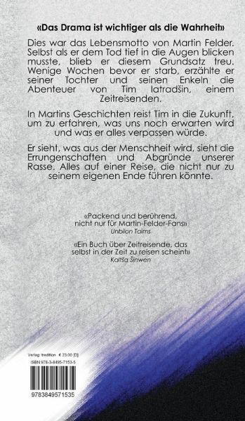 "Das Drama ist wichtiger als die Wahrheit" Dies war das Lebensmotto von Martin Felder. Selbst als er dem Tod tief in die Augen blicken musste, blieb er diesem Grundsatz treu. Wenige Wochen bevor er starb, erzählte er seiner Tochter und seinen Enkeln die Abenteuer von Tim Iatrad in, einem Zeitreisenden.In Martins Geschichten reist Tim in die Zukunft um zu erfahren, was uns noch erwarten wird und was er alles verpassen würde.Er sieht, was aus der Menschheit wird, sieht die Errungenschaften und Abgründe unsererRasse. Alles auf einer Reise, die nicht nur zu seinem eigenen Ende führen könnte.Dies ist nicht nur ein Sammelband mit den letzten bekannten Geschichten von Martin Felder. Dies ist auch eine Art Biografie, die sich nicht jedem Leser auf anhieb zeigen wird. Ist sie doch so codiert und mysteriös wie Martin es schon immer liebte.Felder nimmt uns auf eine Reise in die Zukunft mit, die überraschend detailliert und glaubwürdig wirkt. In eine Zukunft, die uns nicht nur abschrecken soll, sondern auch viel Hoffnung und staunen bietet. Man wünscht sich, schon jetzt in einer dieser Zeiten leben zu können."Packend und berührend, nicht nur für Martin-Felder-Fans"Unbilon Taims"Ein Buch über Zeitreisende, das selbst in der Zeit zu reisen scheint"Kalt a inwen