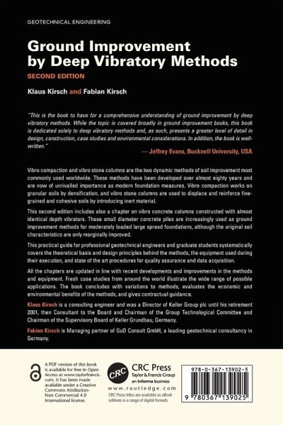 Vibro compaction and vibro stone columns are the two dynamic methods of soil improvement most commonly used worldwide. These methods have been developed over almost eighty years and are now of unrivalled importance as modern foundation measures. Vibro compaction works on granular soils by densification, and vibro stone columns are used to displace and reinforce fine-grained and cohesive soils by introducing inert material. This practical guide for professional geotechnical engineers and graduate students systematically covers the theoretical basis and design principles behind the methods, the equipment used during their execution, and state of the art procedures for quality assurance and data acquisition. All the chapters are updated in line with recent developments and improvements in the methods and equipment. Fresh case studies from around the world illustrate the wide range of possible applications. The book concludes with variations to methods, evaluates the economic and environmental benefits of the methods, and gives contractual guidance. The Open Access version of this book, available at http://www.taylorfrancis.com, has been made available under a Creative Commons Attribution-Non Commercial-No Derivatives 4.0 license