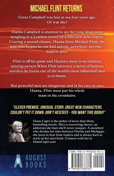 The thrilling new unputdownable Michael Flint novel from Best Selling Author Diane Capri! Greta Campbell was lost at sea four years ago. Or was she? "Clever premise, unusual story, great new characters. Couldn't put it down. Don't hesitate - you want this book!!" Hanna Campbell is stunned to see her long dead sister mingling in a crowd on a televised news report. Craving a second chance, Hanna hires Michael Flint, the man who boasts he can find anyone, anywhere, anytime - dead or alive. Flint is off his game and Hanna's sister is no ordinary missing person. When Flint uncovers a series of heinous murders he learns one of the world's most influential men is to blame. But powerful men are dangerous and in his race to save Hanna, Flint must put his whole team in the crosshairs.