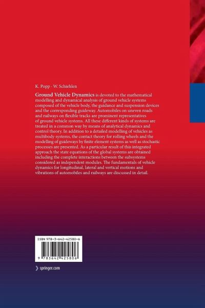 Ground Vehicle Dynamics is devoted to the mathematical modelling and dynamical analysis of ground vehicle systems composed of the vehicle body, the guidance and suspension devices and the corresponding guideway. Automobiles on uneven roads and railways on flexible tracks are prominent representatives of ground vehicle systems. All these different kinds of systems are treated in a common way by means of analytical dynamics and control theory. In addition to a detailed modelling of vehicles as multibody systems, the contact theory for rolling wheels and the modelling of guideways by finite element systems as well as stochastic processes are presented. As a particular result of this integrated approach the state equations of the global systems are obtained including the complete interactions between the subsystems considered as independent modules. The fundamentals of vehicle dynamics for longitudinal, lateral and vertical motions and vibrations of automobiles and railways are discussed in detail.