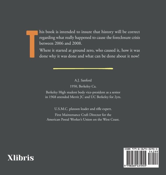 This book is intended to insure that history will be correct regarding what really happened to cause the foreclosure crisis between 2006 and 2008. Where it started at ground zero, who caused it, how it was done why it was done and what can be done about it now!