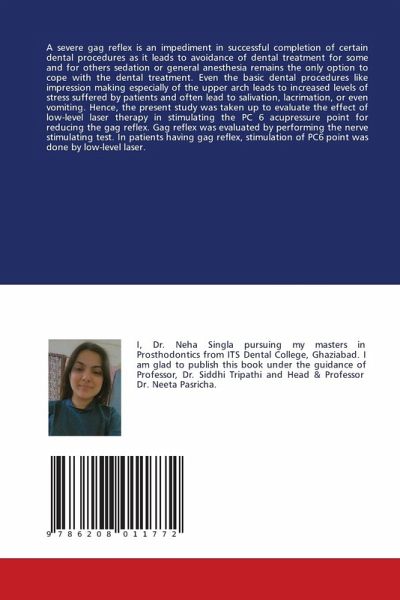 A severe gag reflex is an impediment in successful completion of certain dental procedures as it leads to avoidance of dental treatment for some and for others sedation or general anesthesia remains the only option to cope with the dental treatment. Even the basic dental procedures like impression making especially of the upper arch leads to increased levels of stress suffered by patients and often lead to salivation, lacrimation, or even vomiting. Hence, the present study was taken up to evaluate the effect of low-level laser therapy in stimulating the PC 6 acupressure point for reducing the gag reflex. Gag reflex was evaluated by performing the nerve stimulating test. In patients having gag reflex, stimulation of PC6 point was done by low-level laser.