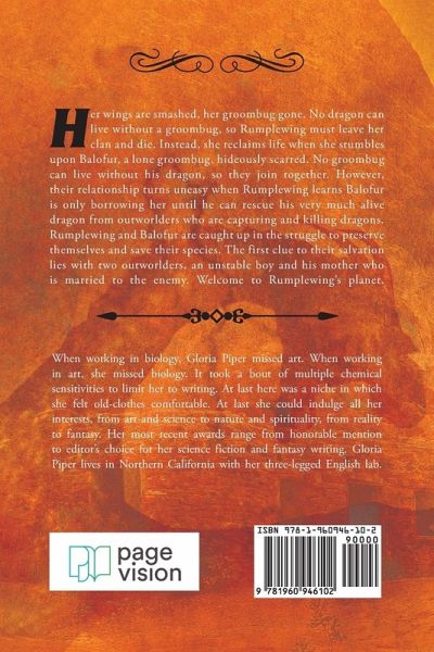 Her wings are smashed, her groombug gone. No dragon can live without a groombug, so Rumplewing must leave her clan and die. Instead, she reclaims life when she stumbles upon Balfour, a lone groombug, hideously scarred. No groombug can live without his dragon, so they join together. However, their relationship turns uneasy when Rumplewing learns Balfour is only borrowing her until he can rescue his very much alive dragon from outworlders who are capturing and killing dragons. Rumplewing and Balfour are caught up in the struggle to preserve themselves and save their species. The first clue to their salvation lies with two outworlders, an unstable boy and his mother who is married to the enemy. Welcome to Rumplewing's planet.