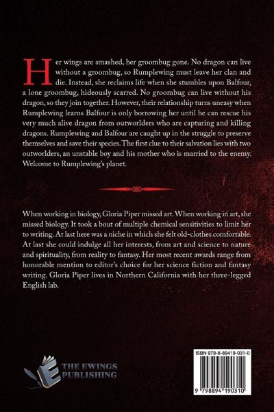 Her wings are smashed, her groombug gone. No dragon can live without a groombug, so Rumplewing must leave her clan and die. Instead, she reclaims life when she stumbles upon Balfour, a lone groombug, hideously scarred. No groombug can live without his dragon, so they join together. However, their relationship turns uneasy when Rumplewing learns Balfour is only borrowing her until he can rescue his very much alive dragon from outworlders who are capturing and killing dragons. Rumplewing and Balfour are caught up in the struggle to preserve themselves and save their species. The first clue to their salvation lies with two outworlders, an unstable boy and his mother who is married to the enemy. Welcome to Rumplewing's planet.