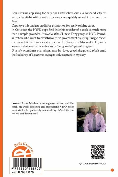 Grounders are cop slang for easy open and solved cases. A husband kills his wife, a bar-fight with a knife or a gun, cases quickly solved in two or three days. Cops love this and get credit for promotion for easily solving cases. In Grounders the NYPD cops find that this murder of a cook is much more than a simple grounder. It involves the Chinese Tong gangs in NYC, Peruvian rebels who want to overthrow their government by using "magic rocks" that were left from an alien civilization like Stargate in Machu-Picchu, and a love story between a detective and a Tong leader's granddaughter. Grounders combines everything; murder, love, greed, drugs, and rebels amid the backdrop of detectives trying to solve a murder mystery. Leonard Love Matlick is an engineer, writer, and lifecoach. He works designing and maintaining NYPD police precincts. He has previously published Cops lie! and The success and confidence manual.