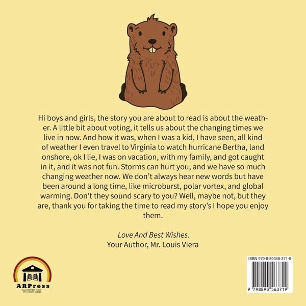 Hi boys and girls, the story you are about to read is about weather. A little bit about voting, it tells us about the changing times we live in now. And how it was, when I was a kid, I have seen, all kind of weather I even travel to Virginia to watch hurricane Bertha, land onshore, ok I lie, I was on vacation, with my family, and got caught in it, and it was not fun. Storms can hurt you, and we have so much changing weather now. We don't always hear new words but have been around a long time, like microburst, polar vortex, and global warming. Don't they sound scary to you? Well, maybe not, but they are, thank you for taking the time to read my story's I hope you enjoy them.