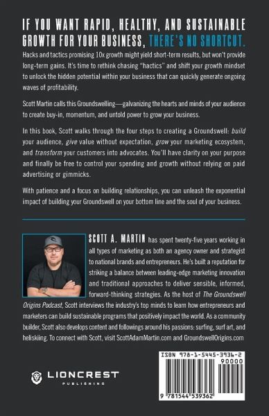 If you want rapid, healthy, and sustainable growth for your business, there's no shortcut. Hacks and tactics promising 10x growth might yield short-term results but won't provide long-term gains. It's time to rethink chasing "hactics" and shift your growth mindset to unlock the hidden potential within your business that can quickly generate ongoing waves of profitability. Scott Martin calls this Groundswelling-galvanizing the hearts and minds of your audience to create buy-in, momentum, and untold power to grow your business. In this book, Scott walks through the four steps to creating a groundswell: building your plan, giving value without expectation, growing your marketing ecosystem, and transforming your customers into advocates. You'll have clarity on your purpose and finally be free to control your spending and growth without relying on paid advertising or gimmicks. With patience and a focus on building relationships, you can unleash the exponential impact of building your Groundswell on your bottom line and the soul of your business.