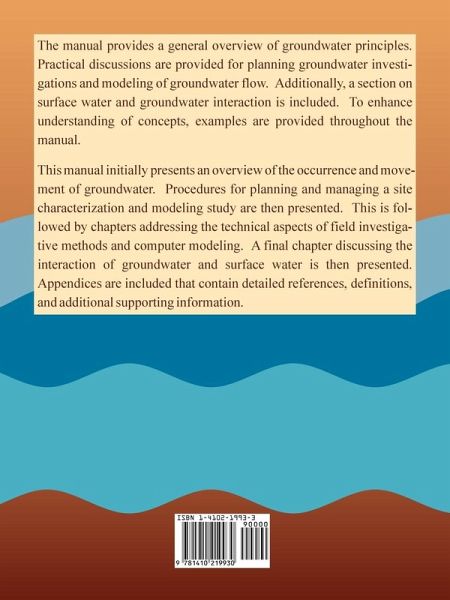 The manual provides a general overview of groundwater principles. Practical discussions are provided for planning groundwater investigations and modeling of groundwater flow. Additionally, a section on surface water and groundwater interaction is included. To enhance understanding of concepts, examples are provided throughout the manual. This manual initially presents an overview of the occurrence and movement of groundwater. Procedures for planning and managing a site characterization and modeling study are then presented. This is followed by chapters addressing the technical aspects of field investigative methods and computer modeling. A final chapter discussing the interaction of groundwater and surface water is then presented. Appendices are included that contain detailed references, definitions, and additional supporting information.