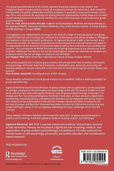 "The author expands and revitalizes group analysis with perspectives from evolution, philosophy and psychology of the self, theories of emotions, mentalization and, above all, personality. An essential reading for people interested in the front-line of contemporary group analytic theory and practice." - Thor Kristian Island M.D. Founding director of IGA, Norway.