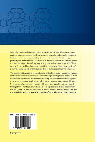 Polycyclic groups are built from cyclic groups in a specific way. They arise in many contexts within group theory itself but also more generally in algebra, for example in the theory of Noetherian rings. The first half of this book develops the standard group theoretic techniques for studying polycyclic groups and the basic properties of these groups. The second half then focuses specifically on the ring theoretic properties of polycyclic groups and their applications, often to purely group theoretic situations.
