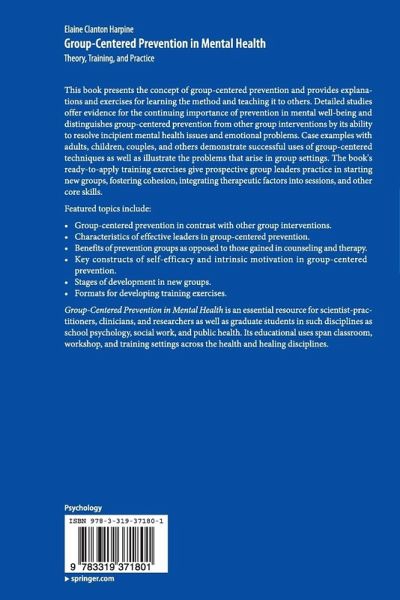 "Group-Centered Prevention in Mental Health is a text for teaching group-centered prevention in graduate programs as well as a step-by-step guide for practitioners who need to understand how to put together group interventions for use in building a cohesive environment ... . this book can be a great motivator for professionals (e.g., psychologists, health care social workers, school counselors) to start thinking about other problems that can be solved in a group-centered prevention program." (Leslie B. Rosen, PsycCRITIQUES, Vol. 61 (24), June, 2016)