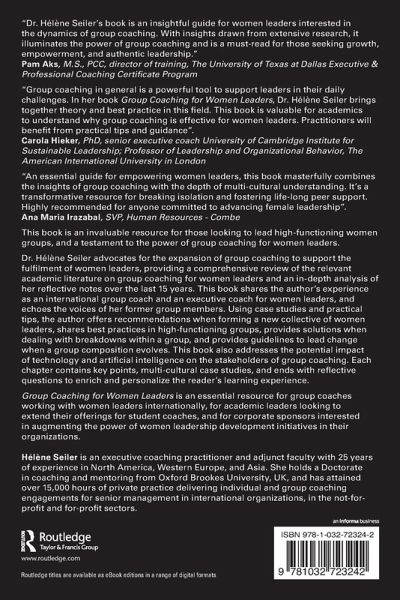 Dr. Hélène Seiler advocates for the expansion of group coaching to support the fulfilment of women leaders, providing a comprehensive review of the relevant academic literature on group coaching for women leaders and an in-depth analysis of her reflective notes over the last 15 years. This book shares the author's experience as an international group coach and an executive coach for women leaders, and echoes the voices of her former group members. Using case studies and practical tips, the author offers recommendations when forming a new collective of women leaders, shares best practices in high-functioning groups, provides solutions when dealing with breakdowns within a group, and provides guidelines to lead change when a group composition evolves. This book also addresses the potential impact of technology and artificial intelligence on the stakeholders of group coaching. Each chapter contains key points, multi-cultural case studies, and ends with reflective questions to enrich and personalize the reader's learning experience.