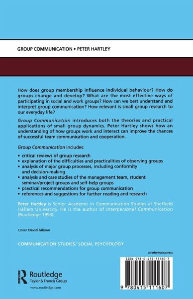 Group Communication introduces applications of small group dynamics. Hartley shows how an understanding of how groups work and interact can improve the chances of successful team communication and cooperation. Group Communication includes: * critical reviews of group research * explanation of the difficulties and practicalities of observing groups * analysis of major group processes, including conformity and decision-making * analysis and case studies of the management team, student seminar/project groups and self-help groups * practical recommendation for group communication * references and suggestions for further reading and research.