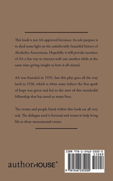 This book is not AA-approved literature. Its sole purpose is to shed some light on the unbelievably beautiful history of Alcoholics Anonymous. Hopefully, it will provide members of AA a fun way to interact with one another while at the same time giving insight to how it all started. AA was founded in 1935, but this play goes all the way back to 1926, which is when some believe the first spark of hope was given and led to the start of this wonderful fellowship that has saved so many lives. The events and people listed within this book are all very real. The dialogue used is fictional and meant to help bring life to these monumental events.
