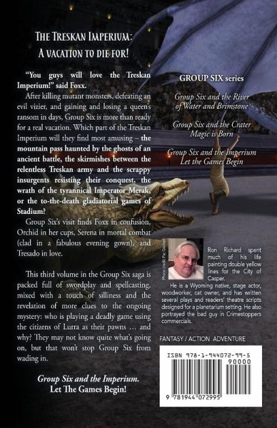 The Treskan Imperium: A vacation to die for! "You guys will love the Treskan Imperium!" said Foxx. After killing mutant monsters, defeating an evil vizier, and gaining and losing a queen's ransom in days, Group Six is more than ready for a real vacation. Which part of the Treskan Imperium will they find most amusing - the mountain pass haunted by the ghosts of an ancient battle, the skirmishes between the relentless Treskan army and the scrappy insurgents resisting their conquest, the wrath of the tyrannical Imperator Merak, or the to-the-death gladiatorial games of Stadium? Group Six's visit finds Foxx confused, Orchid in her cups, Serena in mortal combat (clad in a fabulous evening gown), and Tresado in love. This third volume in the Group Six saga is packed full of swordplay and spellcasting, mixed with a touch of silliness and the revelation of more clues to the ongoing mystery: who is playing a deadly game using the citizens of Lurra as their pawns ... and why? They may not know quite what's going on, but that won't stop Group Six from wading in.Group Six and the Imperium. Let The Games Begin! = = =Ron RichardRonRichardAuthor.com Christopher Matthews Publishing (imprint of First Steps Publishing)For readers of Piers Anthony, Robert Asprin, Fritz Leiber, and Terry Pratchett Teen and Young Adult, Adult Humor Fantasy Adventure Fantasy / Science Fiction / Action & Adventure / Dragons & Mythical Creatures / Mythical Quest / Sword & Sorcery, Magic