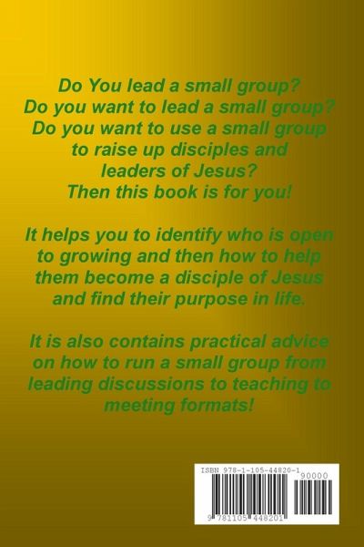 Do You lead a small group? Do you want to lead a small group? Do you want to use a small group to raise up disciples and leaders of Jesus? Then this book is for you! It helps you to identify who is open to growing and then how to help them become a disciple of Jesus and find their purpose in life. It is also contains practical advice on how to run a small group from leading discussions to teaching to meeting formats!