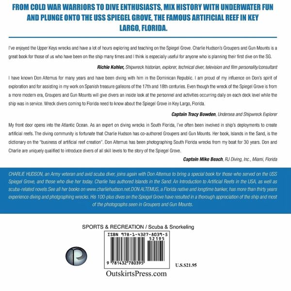 Groupers and Gun Mounts Back Cover: Non-Fiction/Maritime History/Scuba/Eco-tourism From Cold War warriors to dive enthusiasts, mix a little history with underwater fun as you plunge inside the USS Spiegel Grove, the famous artificial reef in Key Largo, Florida. "I've enjoyed the Upper Keys wrecks and have a lot of hours exploring and teaching on the Spiegel Grove. Charlie Hudson's Groupers and Gun Mounts is a great book for those of us who have been on the ship many times and I think is especially useful for anyone who is planning their first dive on the SG." -Richie Kohler, Shipwreck historian, explorer, technical diver, television and film personality/consultant "I have known Don Altemus for many years and have been diving with him in the Dominican Republic. I am proud of my influence on Don's spirit of exploration and for assisting in my work on Spanish treasure galleons of the 17th and 18th centuries. Even though the wreck of the Spiegel Grove is from a more modern era, Groupers and Gun Mounts will give divers an inside look at the personnel and activities occurring daily on each deck level while the ship was in service. Wreck divers coming to Florida need to know about the Spiegel Grove in Key Largo, Florida." -Captain Tracy Bowdon, Undersea and Shipwreck Explorer "My front door opens into the Atlantic Ocean. As an expert on diving wrecks in South Florida, I've often been involved in ships' deployments to create artificial reefs. The diving community is fortunate that Charlie Hudson has co-authored Groupers and Gun Mounts. Her book, Islands in the Sand, is the dictionary on the "business of artificial reef creation." Don Altemus has been photographing South Florida wrecks from my boat for 30 years. Don and Charlie are uniquely qualified to introduce divers of all skill levels to the story of the Spiegel Grove." -Captain Mike Beach, RJ Diving,Inc., Miami, Florida CHARLIE HUDSON, an Army veteran and avid scuba diver, joins again with Don Altemus to bring a special book for those who served on the USS Spiegel Grove, and those who dive her today. Charlie has authored Islands in the Sand: An Introduction to Artificial Reefs in the USA, as well as scuba-related novels. See all her books on www.charliehudson.net DON ALTEMUS, a Florida native and longtime banker, has more than thirty years experience diving and photographing wrecks. His 100-plus dives on the Spiegel Grove have resulted in a thorough appreciation of the ship and most of the photographs seen in Groupers and Gun Mounts.