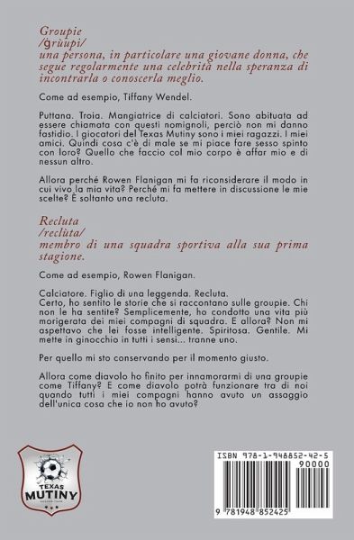Groupie /¿rùupi/ una persona, in particolare una giovane donna, che segue regolarmente una celebrità nella speranza di incontrarla o conoscerla meglio. Come ad esempio, Tiffany Wendel. Puttana. Troia. Mangiatrice di calciatori. Sono abituata ad essere chiamata con questi nomignoli, perciò non mi danno fastidio. I giocatori del Texas Mutiny sono i miei ragazzi. I miei amici. Quindi cosa c'è di male se mi piace fare sesso spinto con loro? Quello che faccio col mio corpo è affar mio e di nessun altro. Allora perché Rowen Flanigan mi fa riconsiderare il modo in cui vivo la mia vita? Perché mi fa mettere in discussione le mie scelte? È soltanto una recluta. Recluta /reclùta/ membro di una squadra sportiva alla sua prima stagione. Come ad esempio, Rowen Flanigan. Calciatore. Figlio di una leggenda. Recluta. Certo, ho sentito le storie che si raccontano sulle groupie. Chi non le ha sentite? Semplicemente, ho condotto una vita più morigerata dei miei compagni di squadra. E allora? Non mi aspettavo che lei fosse intelligente. Spiritosa. Gentile. Mi mette in ginocchio in tutti i sensi... tranne uno. Per quello mi sto conservando per il momento giusto. Allora come diavolo ho finito per innamorarmi di una groupie come Tiffany? E come diavolo potrà funzionare tra di noi quando tutti i miei compagni hanno avuto un assaggio dell'unica cosa che io non ho avuto? Read less